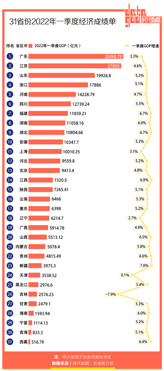 31省市2022年一季度经济成绩单:11省市一季度GDP突破万亿,新疆经济增速最亮眼