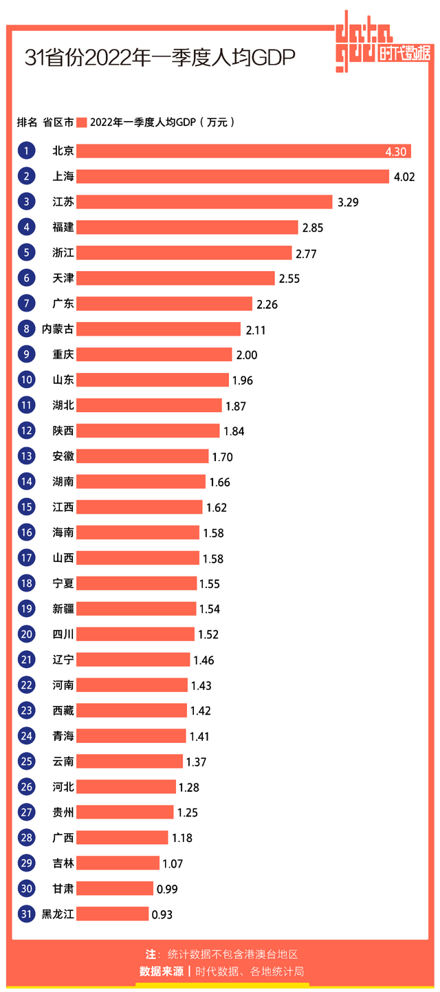 与此同时,随着各省份经济运行情况陆续披露,全国31个省(自治区、直辖市)2022年一季度经济成绩单也悉数出炉。其中,广东一季度GDP继续领跑全国,逼近3万亿元;新疆经济增速最亮眼,一季度GDP同比增长7%。