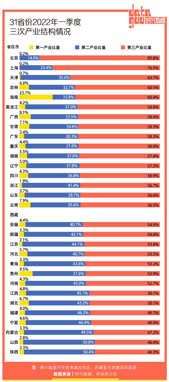 从一季度第三产业比重来看,北京第三产业比重最高,达到85.8%;上海第三产业比重紧随其后,达到76.5%。此外,天津、吉林、海南第三产业比重均超过60%。