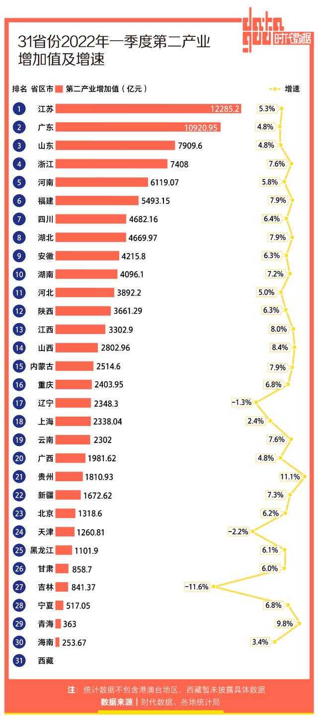 从一季度第二产业增加值来看,江苏第二产业增加值达到12285.2亿元,领跑全国;广东紧随其后,以10920.95亿元的第二产业增加值高居全国第二;山东以7909.6亿元的第二产业增加值位居全国第三。