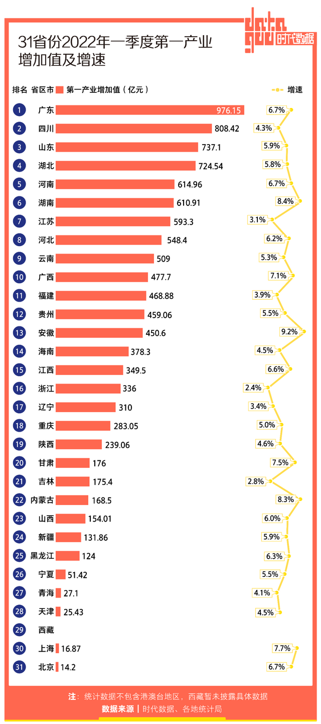 从一季度第一产业增加值来看,广东以976.15亿元的第一产业增加值稳居全国第一。其后,四川以808.42亿元的第一产业增加值位居全国第二;山东以737.1亿元的第一产业增加值位居全国第三。