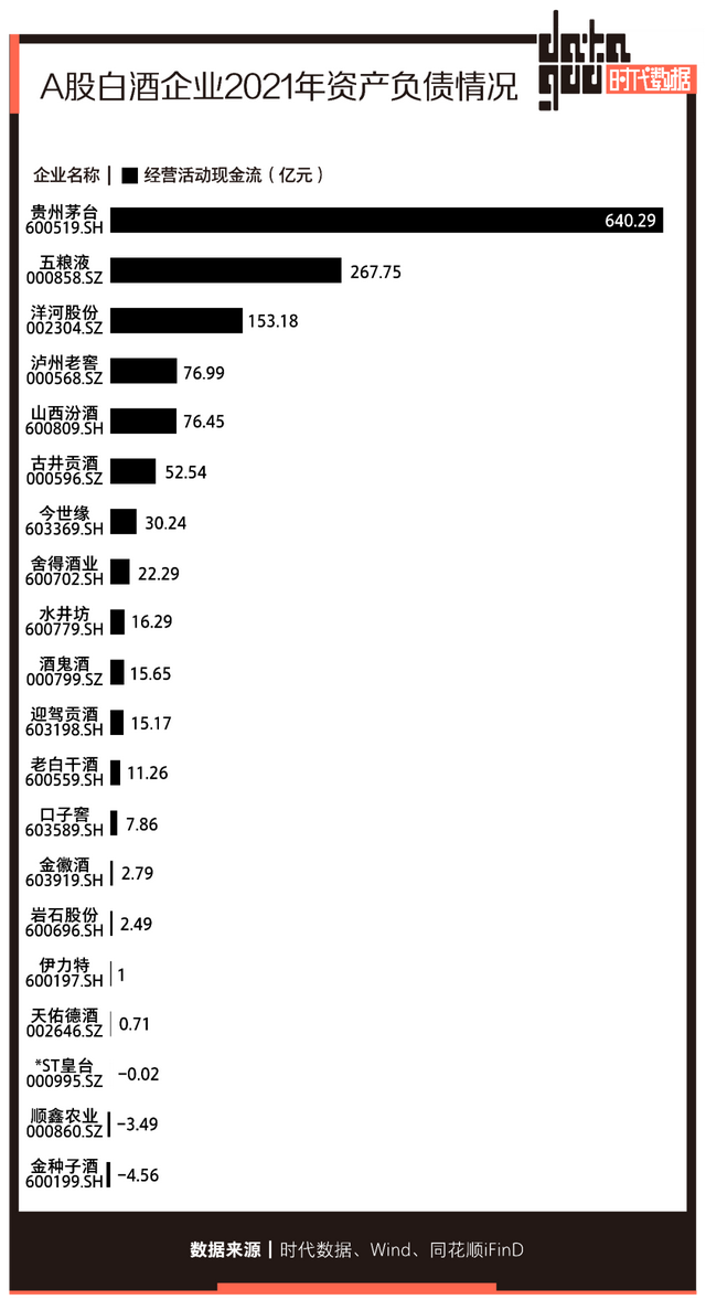 其中,金种子酒(600199)经营活动现金流负值最大,达到-4.56亿元,已经连续6年为负值。另一方面,贵州茅台(600519)的经营活动现金流高达640.29亿元,雄踞第一。