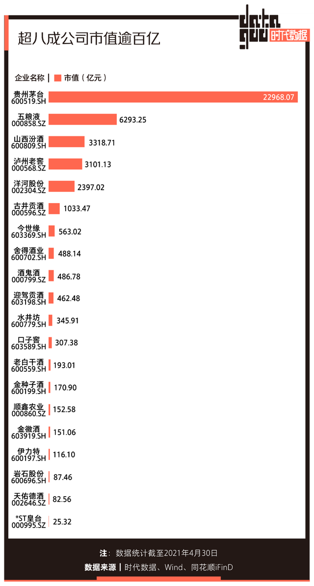 尽管,今年以来,A股白酒企业股价普遍回落,但市值依然较高。据时代数据统计,截至2022年4月30日,一共有17家公司市值超过100亿元,占比达到85%。