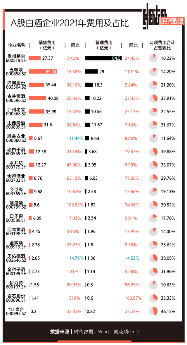 同时,2021年白酒企业的管理费用也大幅增长,仅天佑德酒(002646)一家公司同比减少4.23%至1.36亿元。其中,管理费用同比增加最多的还是岩石股份(600696),2021年管理费用为0.6亿元,同比增加160.87%。