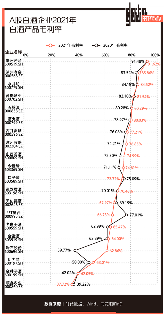 金种子酒(600199)和*ST皇台(000995)业绩出现亏损均与白酒产品毛利率偏低或下滑有关。据时代数据统计,2021年白酒行业整体平均毛利率为70.58%,较2020年微升1.46个百分点。其中,9家公司白酒产品毛利率低于平均值。