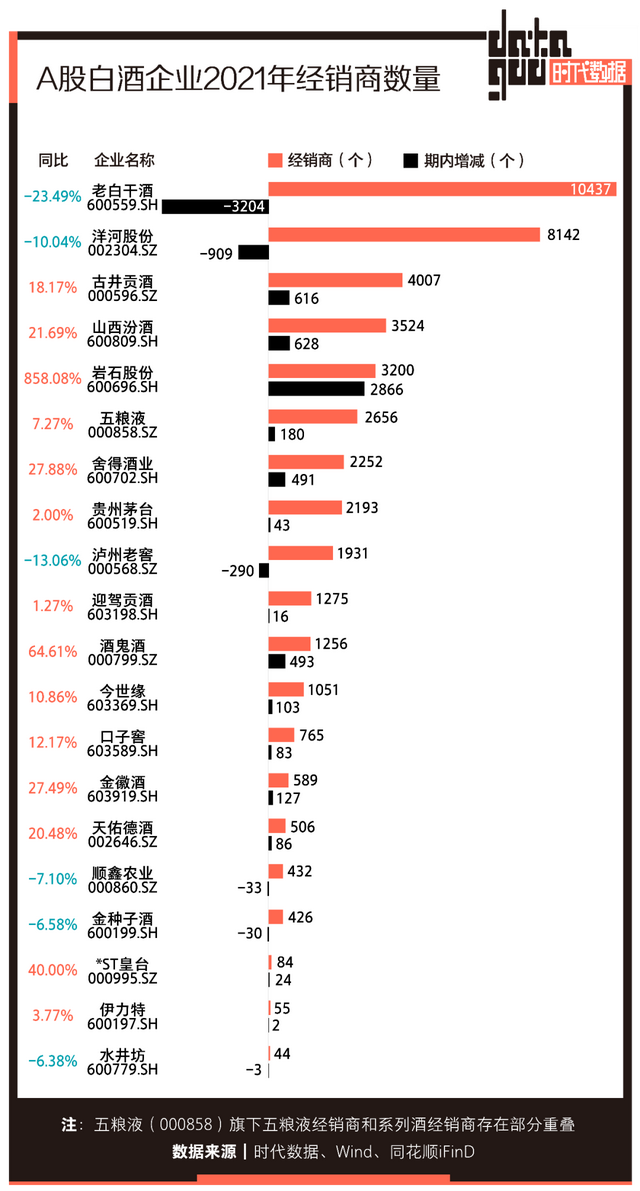 值得注意的是,五粮液(000858)旗下五粮液经销商和系列酒经销商存在部分重叠,其中,五粮液经销商为2054个、系列酒经销商为602个。