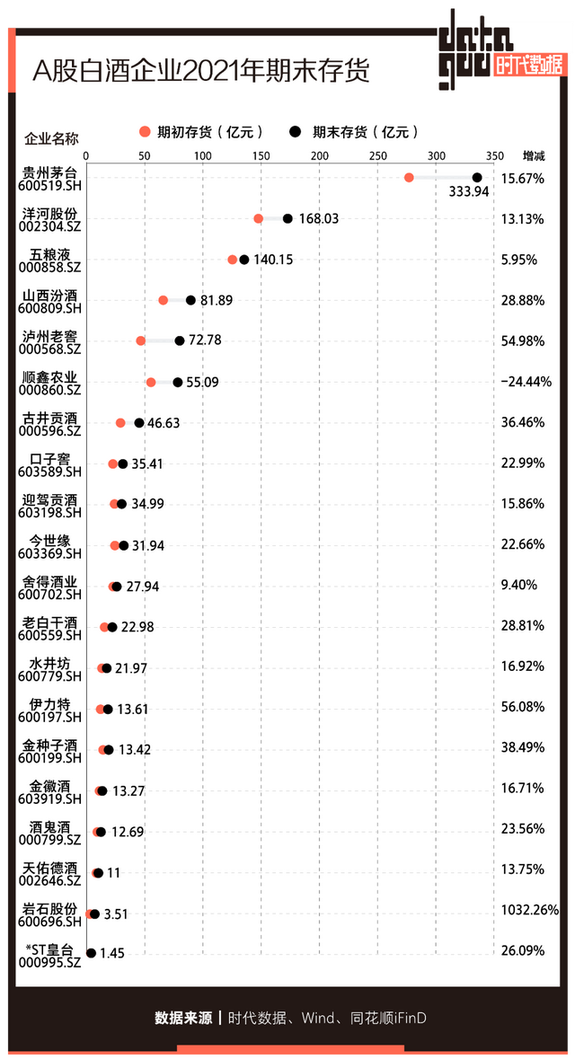 此外,贵州茅台(600519)的期末存货最大,达到333.94亿元;其后,洋河股份(002304)、五粮液(000858)的期末存货均超过百亿元,分别为168.03亿元、140.15亿元。