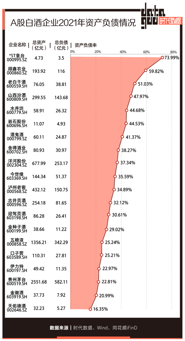 据时代数据统计,A股白酒企业平均负债率为36.74%,负债率超过平均负债率的公司有9家。
