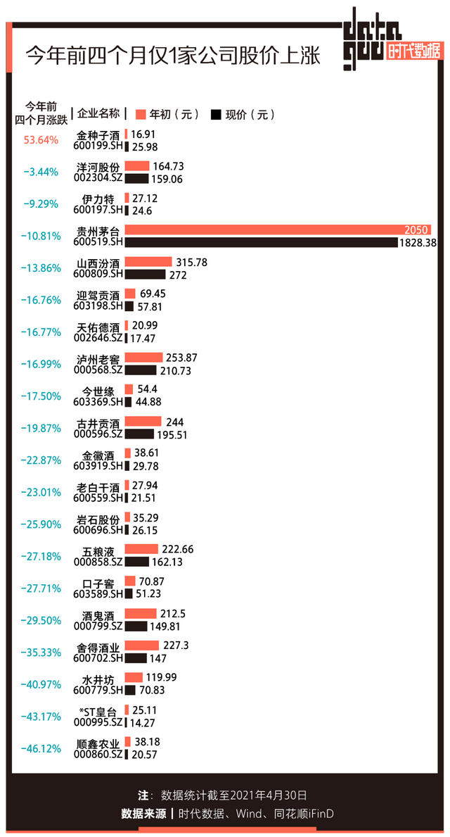 然而,与基金持仓相悖的是,2022年以来白酒企业股价普遍再次从高位回落。据时代数据统计,截至2021年4月30日,在20家白酒企业中有19家公司今年以来股价下跌,平均跌幅约达23.53%。