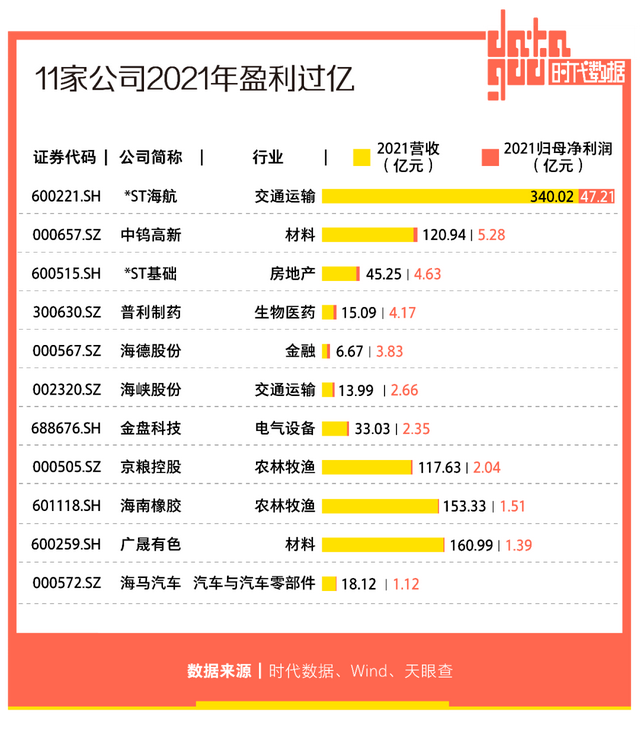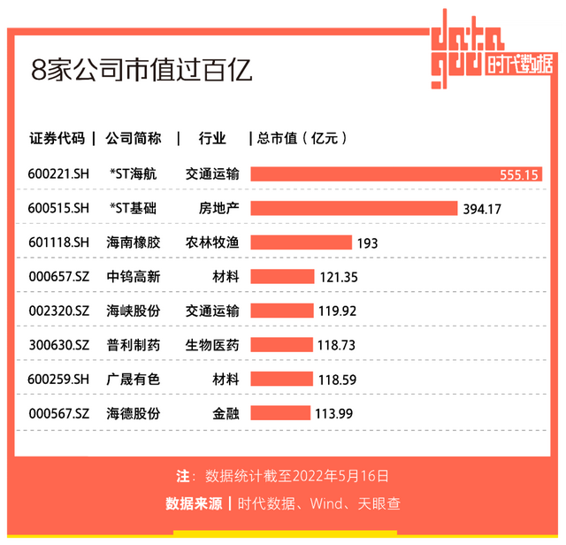 据时代数据统计,截至2022年5月16日,一共有8家公司市值超过100亿元。其中,*ST海航(600221)市值达到555.15亿元,排在第一;*ST基础(600515)市值394.17亿元,排在第二;海南橡胶(601118)市值193亿元,排在第三。