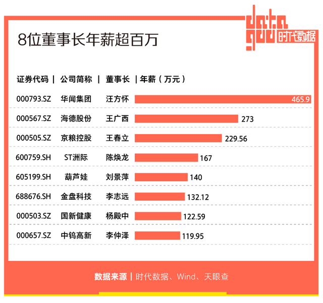 据时代数据统计,在这27家公司中,有8家公司的董事长2021年年薪超过100万元。其中,最高的是华闻集团(000793)董事长兼总经理汪方怀,年薪465.9万元;其次是海德股份(000567)董事长王广西,年薪273万元;京粮控股(000505)董事长王春立以229.56万元年薪位居第三。