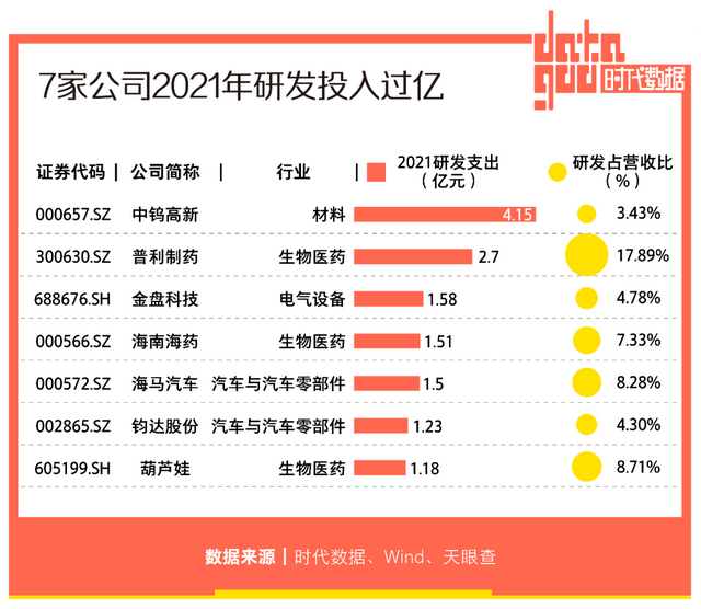 其中,中钨高新(000657)2021年研发投入位居第一,为4.15亿元,占全年营收的3.43%;其后,国内仿制药领域领先企业普利制药(300630)研发投入位居第二,为2.7亿元,占全年营收比高达17.89%。此外,全球领先的新能源电力系统配套提供商金盘科技(688676)以1.58亿元研发支出位居第三,研发占全年营收比为4.78%。