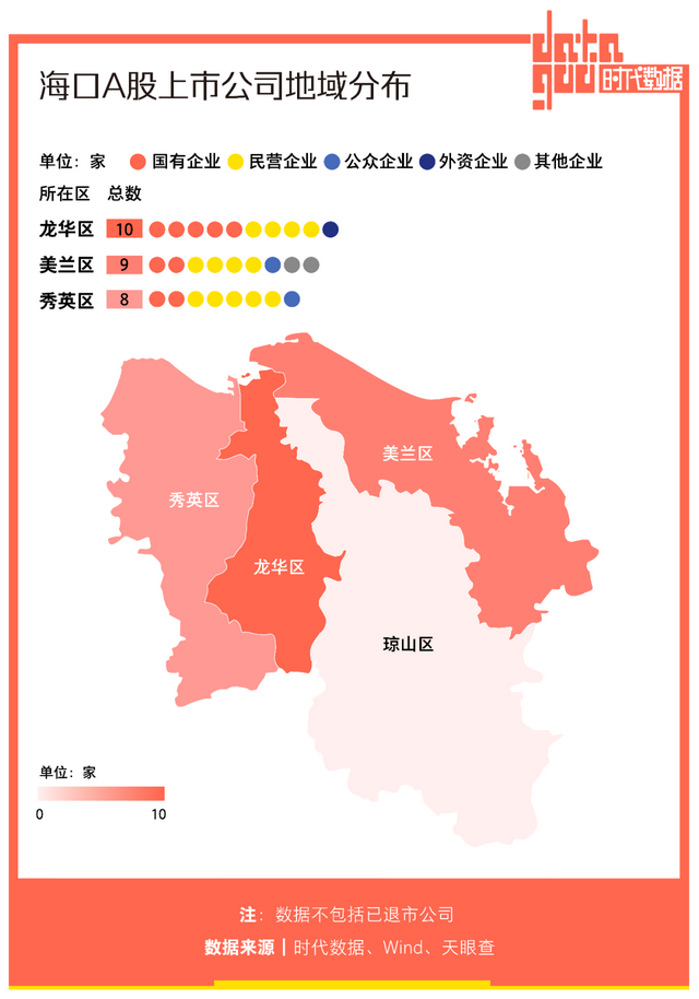 从上市公司地域分布来看,龙华区聚集的上市公司居多,达到10家;其中,国有企业5家、民营企业4家、外资企业1家。其后,美兰区以9家上市公司位居第二;秀英区以8家上市公司位居第三。