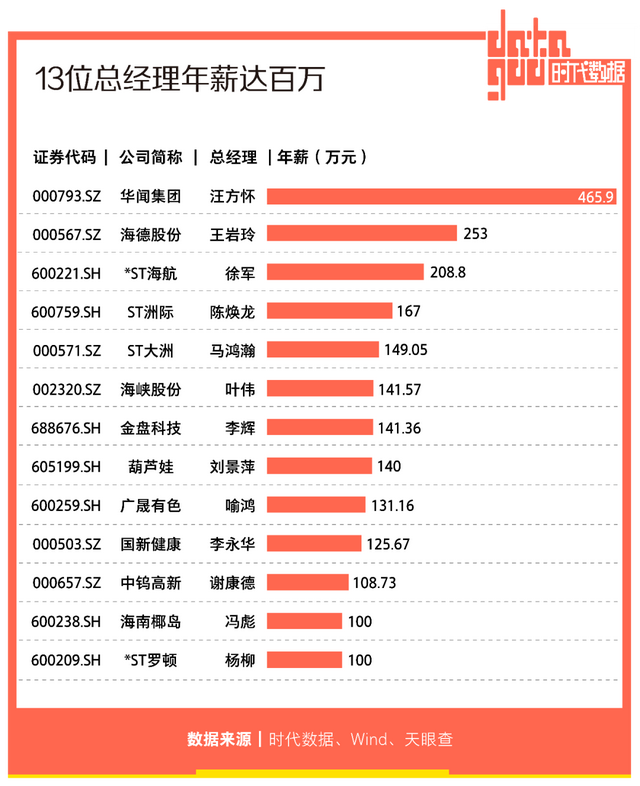 据时代数据统计,在这27家公司中,有13家公司的总经理2021年年薪达到100万元。其中,华闻集团(000793)董事长兼总经理汪方怀年薪居首;海德股份(000567)总经理王岩玲以253万元年薪紧随其后;其后,*ST海航(600221)总经理徐军以208.8万元年薪排在第三。