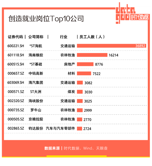 其中,国内领先的航空公司、刚刚完成破产重整的*ST海航(600221)创造的就业岗位居首,接近3.7万个。其后,国内天然橡胶行业领先企业海南橡胶(601118)拥有员工1.62万人,位居第二;最近完成债务重整的*ST基础(600515)拥有员工8776人,位居第三。