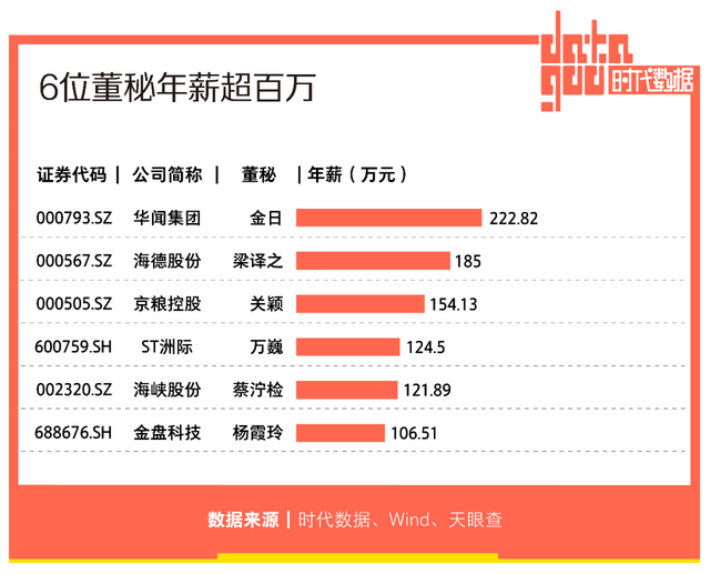 据时代数据统计,在这27家公司中,有6家公司的董秘2021年年薪超过100万元。其中,华闻集团(000793)董秘金日以222.82万元年薪位居第一;海德股份(000567)董秘梁译之以185万元年薪位居第二;京粮控股(000505)董秘关颖以154.13万元年薪位居第三。