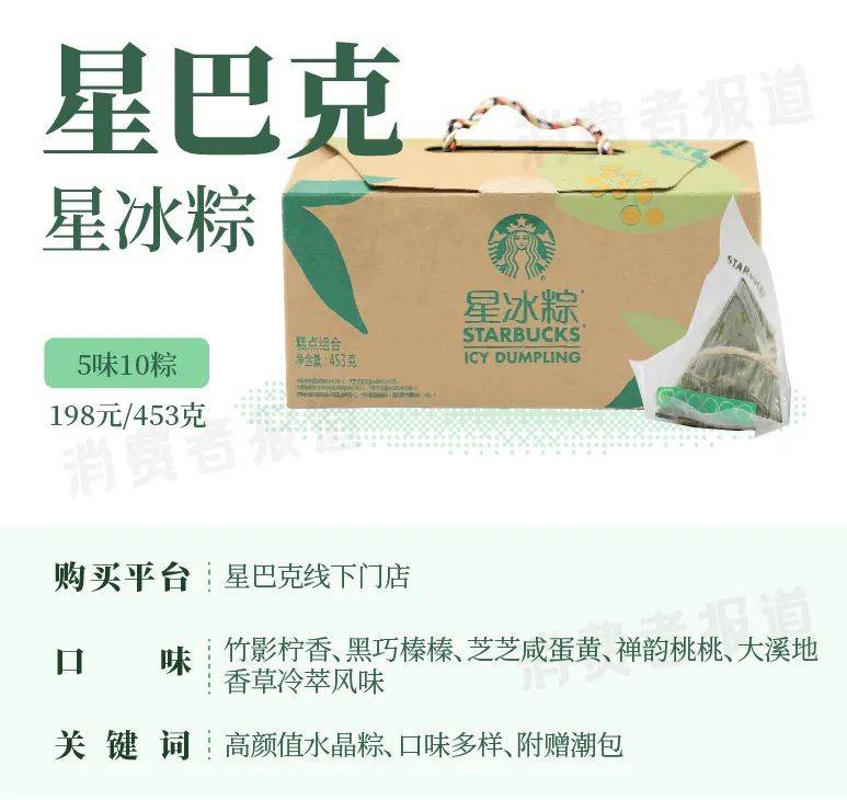 近几年,星巴克都会在端午节前推出限时上市的星冰粽产品。今年的星冰粽礼盒共有五种口味,其中竹影柠香和黑巧榛榛为今年推出的新口味。礼盒中还配备了竹柠跳跳糖蘸粉,另外还有冰尚款、冰逸款两款潮流礼包可供选择。