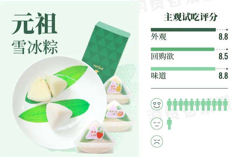 另外,这款雪冰粽也是这次主观试吃中最不像粽子的一款,与其说是粽子,不如说是一只伪装成粽子模样的冰淇淋。不过这可爱的外形也深得试吃官们的喜爱,外观评分高达8.8分。