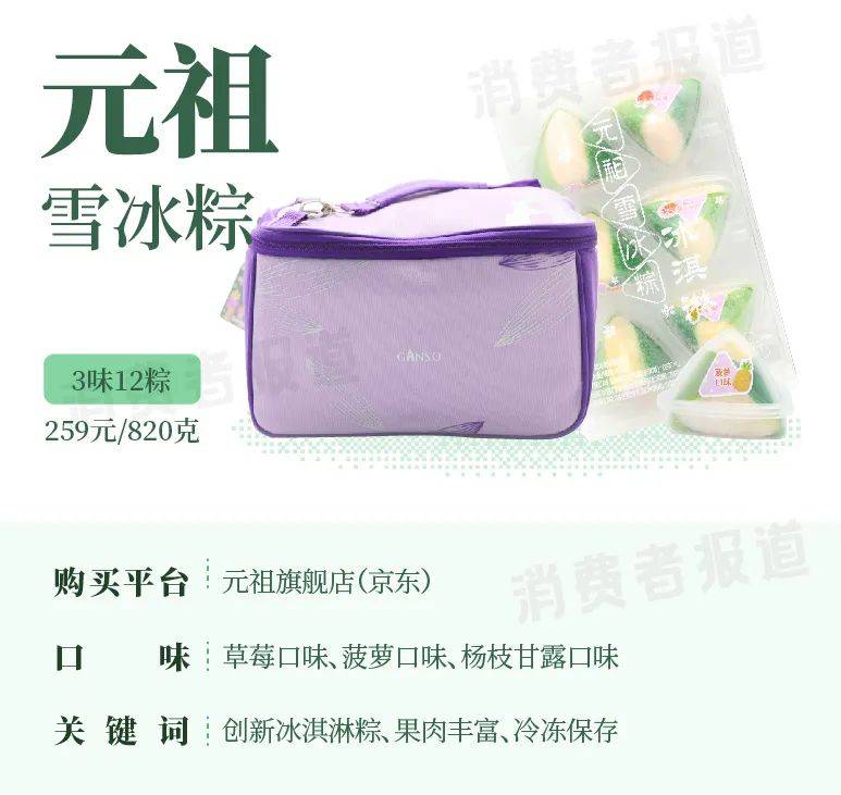 元祖这款雪冰粽礼盒算得上的这次主观试吃中比较贵的一款,259元只有12颗,单颗价格比星巴克的星冰粽还要贵。在其品牌电商旗舰店,这款产品也被称作“高端冰淇淋粽礼盒”。口味上,有草莓口味、菠萝口味和杨枝甘露口味三种。这款产品外层由糯米皮包裹,内馅为冰淇淋,果味与奶味交织,清新可口。
