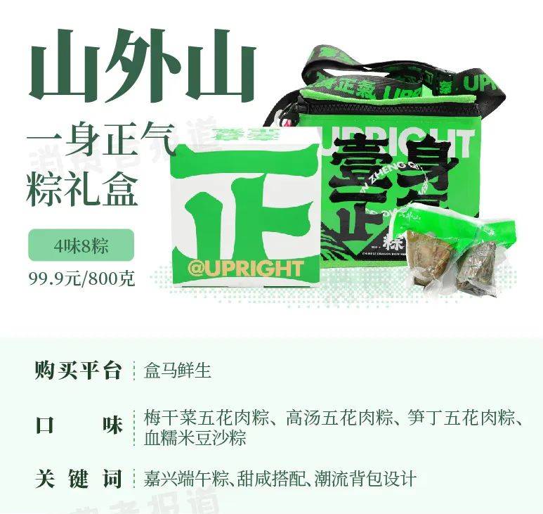 山外山这款一身正气粽不仅名字听起来有趣,外包装设计也格外鲜艳夺目,是时下流行的国潮风设计,但其粽子本身则是比较传统经典的五花肉粽和豆沙粽,是正正经经的嘉兴端午粽。