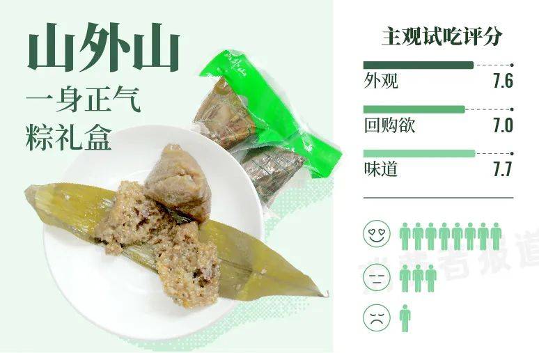 肉粽方面,试吃官大帝点评道粽子软糯可口,松而不散,分量还大,管饱,经典肉粽口味,有家里的味道;试吃官希洛表示糯米带有粽叶的淡淡清香,五花肉粽油脂丰富但不油腻,非常香口;试吃官粽子侠则表示部分馅料是混在粽米里面,个人觉得没有大块馅料的粽子只能称为饭团,还有外包装是荧光绿,有点丑。