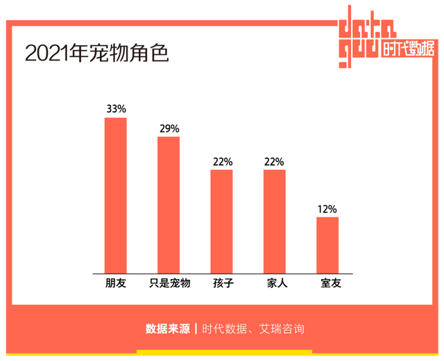 情感成为养宠的主要动机,宠物充当情感角色,代替真实给予宠物主类似朋友、家人等亲密关系的陪伴。《2021年中国宠物消费趋势白皮书》显示,2021年宠物主养宠的原因主要出于情感、功能、兴趣三个方面。九成宠物主出于增添生活情趣、解压、排遣孤独等情感动机养宠物。宠物主更多赋予自己的宠物朋友、孩子、家人和室友等情感化的角色,仅不到三成的宠物主只当宠物看待。