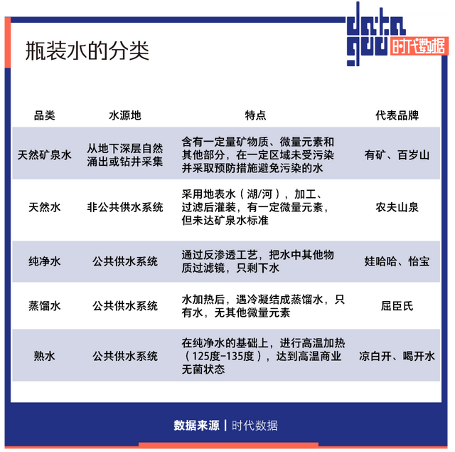 消费者在日常中会习惯将所有瓶装水都称作“矿泉水”,但实际上目前国内大部分品牌均属于包装饮用水,水源来自地表水或公共供水系统。而天然矿泉水除需要是从地下深处自然涌出的或是经人工揭露的、未受污染的地下矿水外,还需要满足国家饮用矿泉水GB8537的国标,是瓶装水市场中相对高端的品类。