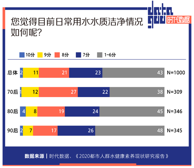 《2020都市人群水健康素养现状研究报告》显示,当代人对目前常用水水质打分,满分10分,选择1-6分的人最多,占比43%。