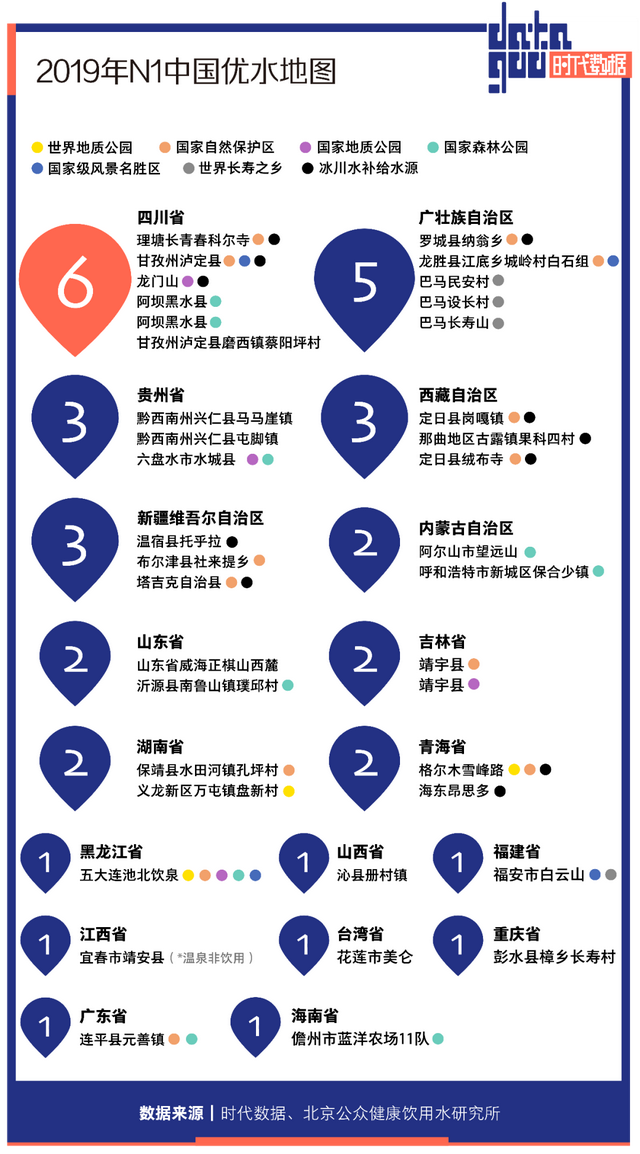 国际健康饮用水产业发展会、中国健康促进基金会等单位根据WHO《饮用水水质准则》及我国《生活饮用水卫生标准》发布的最新版中国优水地图,水源地共38处,大多集中在四川、广西、西藏冰川、新疆产区、长白山及五大连池产区等地。