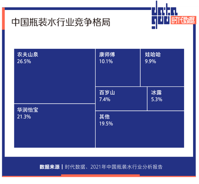 农夫山泉、怡宝以及康师傅三大头部品牌,市场份额分别为26.5%、21.3%、10.1%,占据了瓶装水市场的半壁江山。再加上百岁山、冰露等品牌,八成市场份额基本已被瓜分完毕。