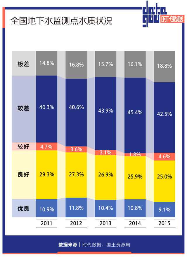 国土资源局发布的最新数据显示,2011-2015年,监测点水质大约六成是差水。