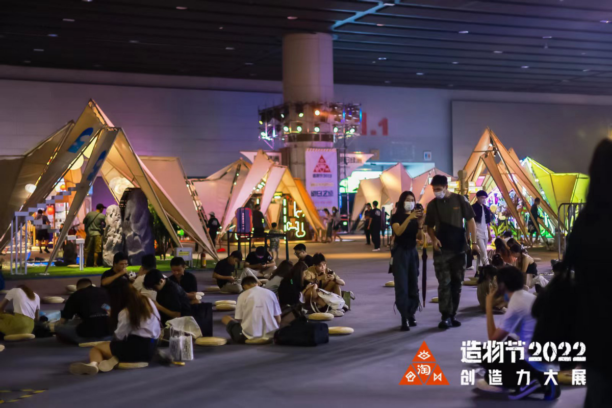 今年造物节划分为生活家居、二次元、户外、植宠、科技、文化、美食七大展区,分别打造成为房舱、制造厂、温室、能源站、绿洲、Club和Studio等科幻场景。进入展厅,游客仿佛置身于一座大型科幻营地,开启一个个奇妙探营体验。