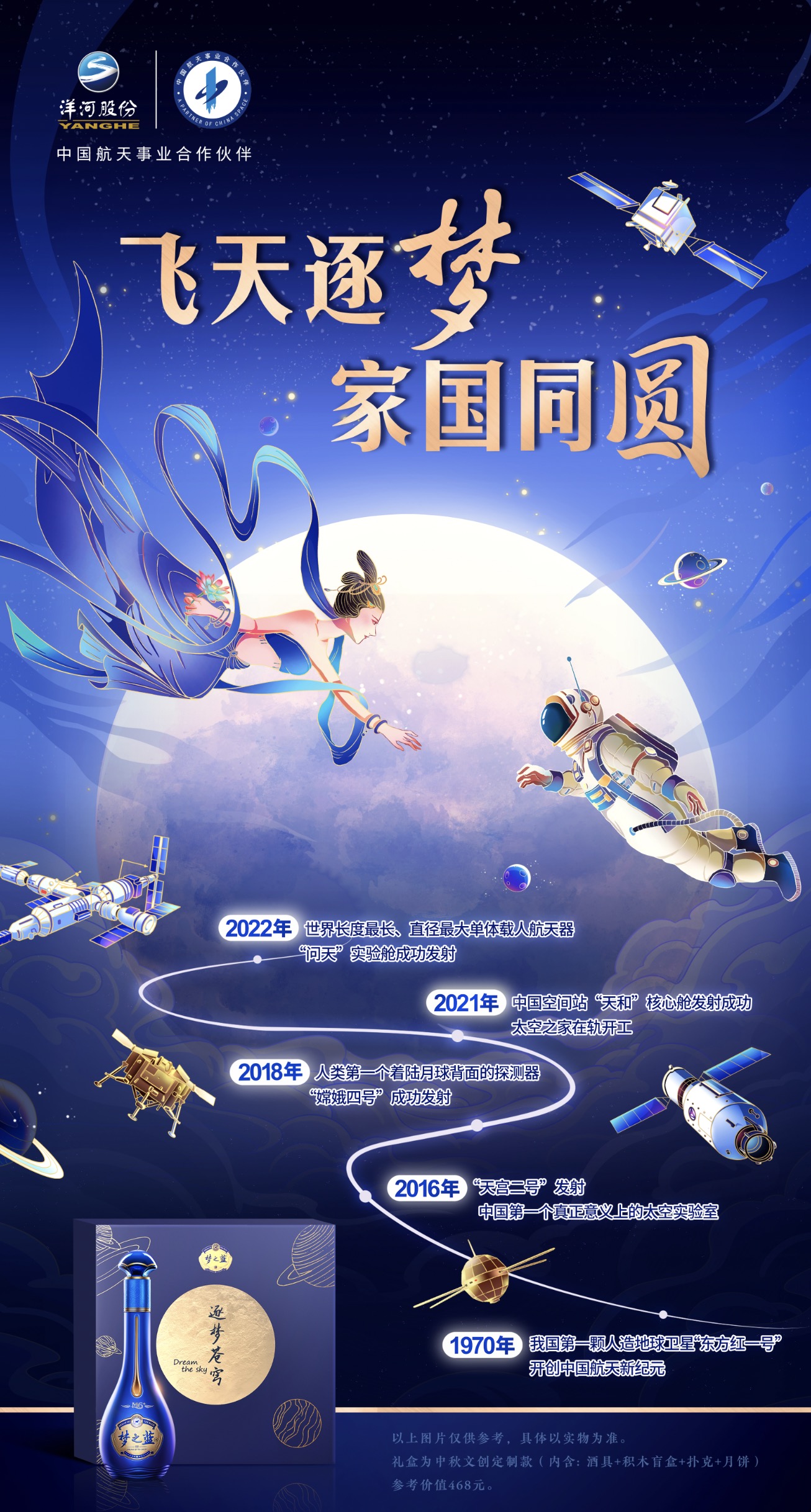 一份礼盒,一头连接着千千万万的追梦者,另一头连接的是飞天梦、家国情。从产品内涵、产品品质、包装设计等方面,梦之蓝中秋礼盒都融合了中国传统文化与洋河的品牌优势,突出了产品的收藏价值、高端卖点,让更多人通过这份特别的中秋礼,体会到航天事业的进步,增强民族自豪感和文化自信。