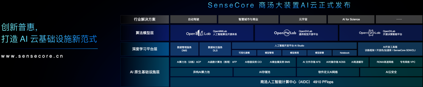 SenseCore商汤大装置AI云是基于商汤AI大装置的一套开箱即用的工业级AI工具链,无需前期投入,即可实现人工智能基础设施的全面数字化管理,为行业提供一套“普惠、弹性、开放”的AI基础设施。SenseCore商汤大装置AI云具备卓越的可扩展性,可有效应对未来工业AI流水线以及 AI大模型的训练、验证、推理需求,帮助客户实现AI研发效率的成倍提高,以及更低的AI基础设施费用,并提供全栈式深度学习平台以及一系列先进的算法平台和模型。商汤大装置AI云将推动自动驾驶、智慧城市、AI for Science及元宇宙等多个行业应用数字化和智能化发展,智造美好未来。