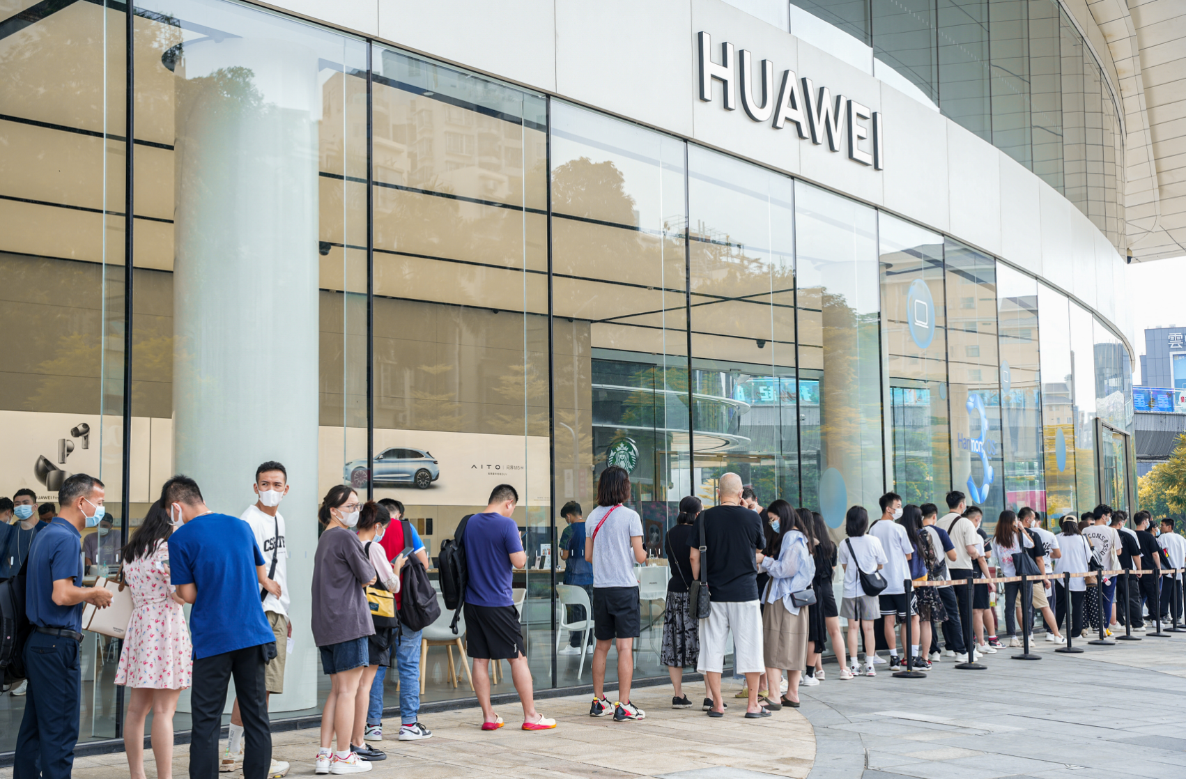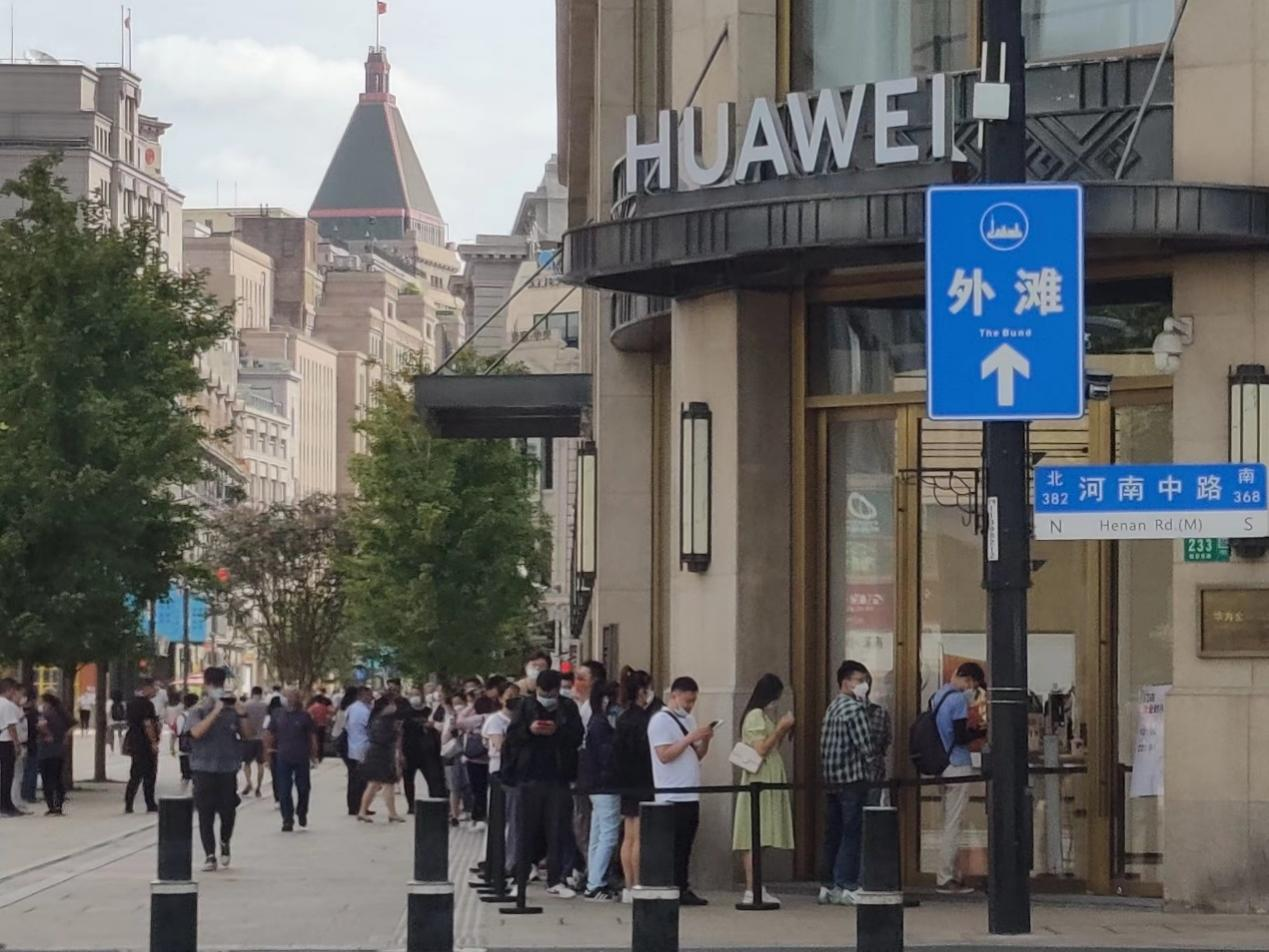9月21日上午9:40,时代周报记者来到位于上海南京东路的华为全球旗舰店,尽管还未开门营业,门店门口已经大排长龙,聚集了众多等待购机的消费者。