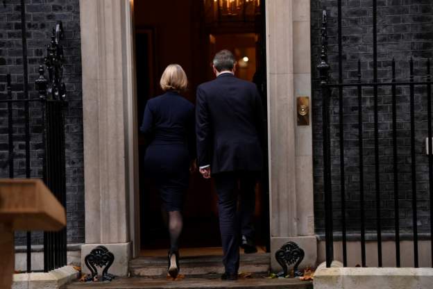 特拉斯宣布辞职后,和丈夫挽手走回唐宁街10号。(图源:社交媒体)