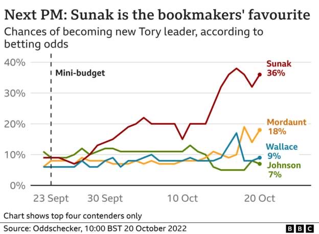 根据博彩公司的数据显示,苏纳克接任的概率最高,与莫当特、华莱士和约翰逊拉开了一定的距离。
