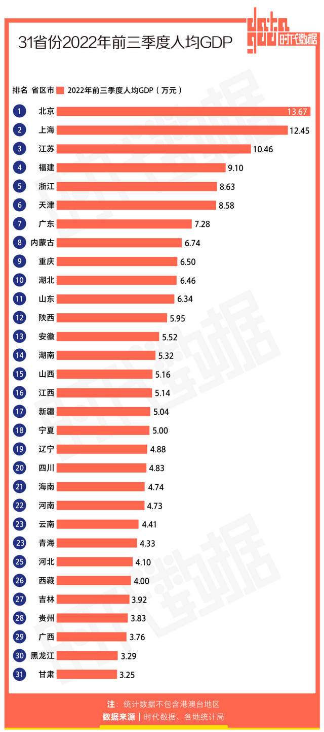 从31省份前三季度人均GDP方面来看,以第七次全国人口普查数据计算,北京前三季度人均GDP继续保持第一,达到13.67万元;上海前三季度人均GDP紧随其后,以12.45万元位列第二。其后,江苏前三季度人均GDP达到10.46万元,位列第三;福建前三季度人均GDP达到9.1万元;浙江、天津前三季度人均GDP均达到8万元;广东前三季度人均GDP达到7.28万元;内蒙古、重庆、湖北、山东前三季度人均GDP均达到6万元。
