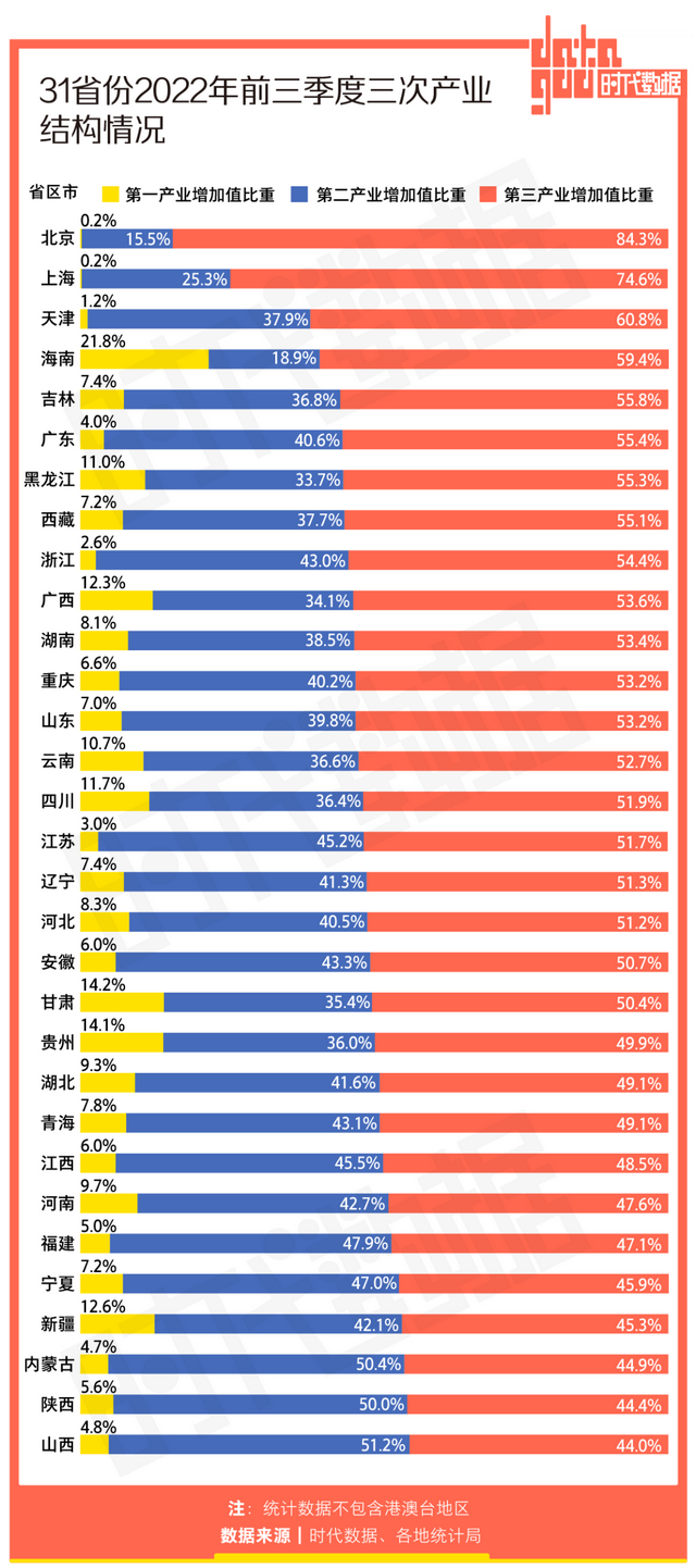 从前三季度第三产业增加值比重来看,北京第三产业增加值比重最高,达到84.3%;上海、天津位居二、三,第三产业增加值比重分别为74.6%、60.8%。