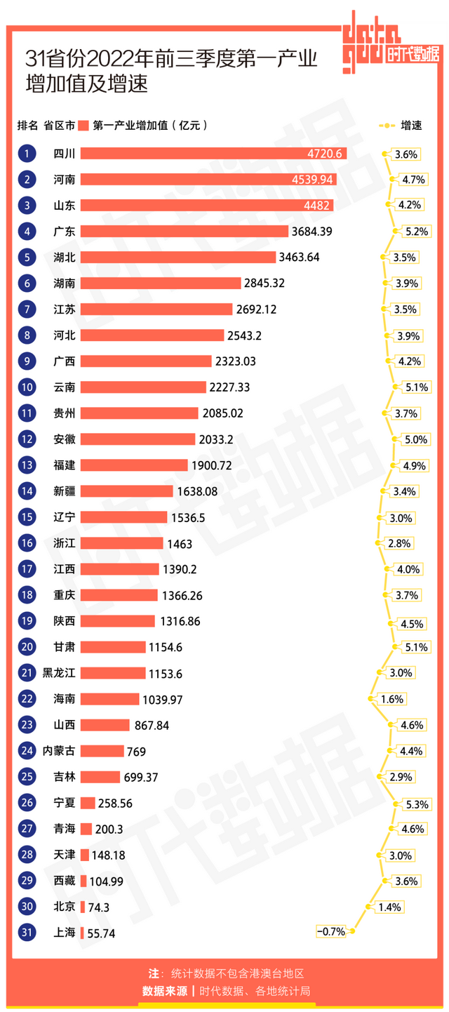 从前三季度第一产业增速来看,宁夏、广东、云南、甘肃、安徽居前,增速分别为5.3%、5.2%、5.1%、5.1%、5.0%。