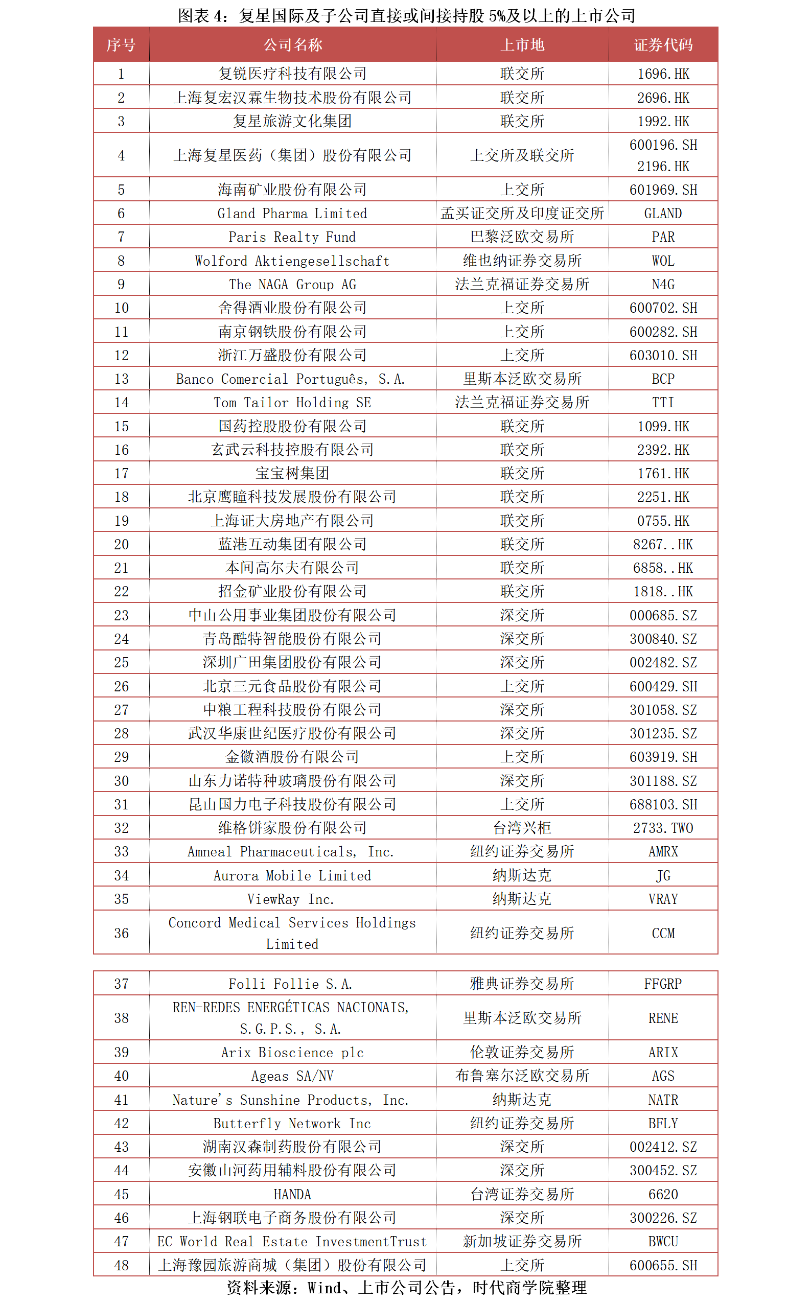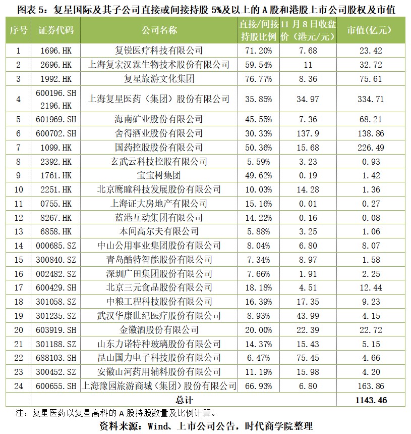 如图表5所示,复星国际及其子公司直接或间接持股比例在5%及以上的A股和港股上市公司共有28家。
