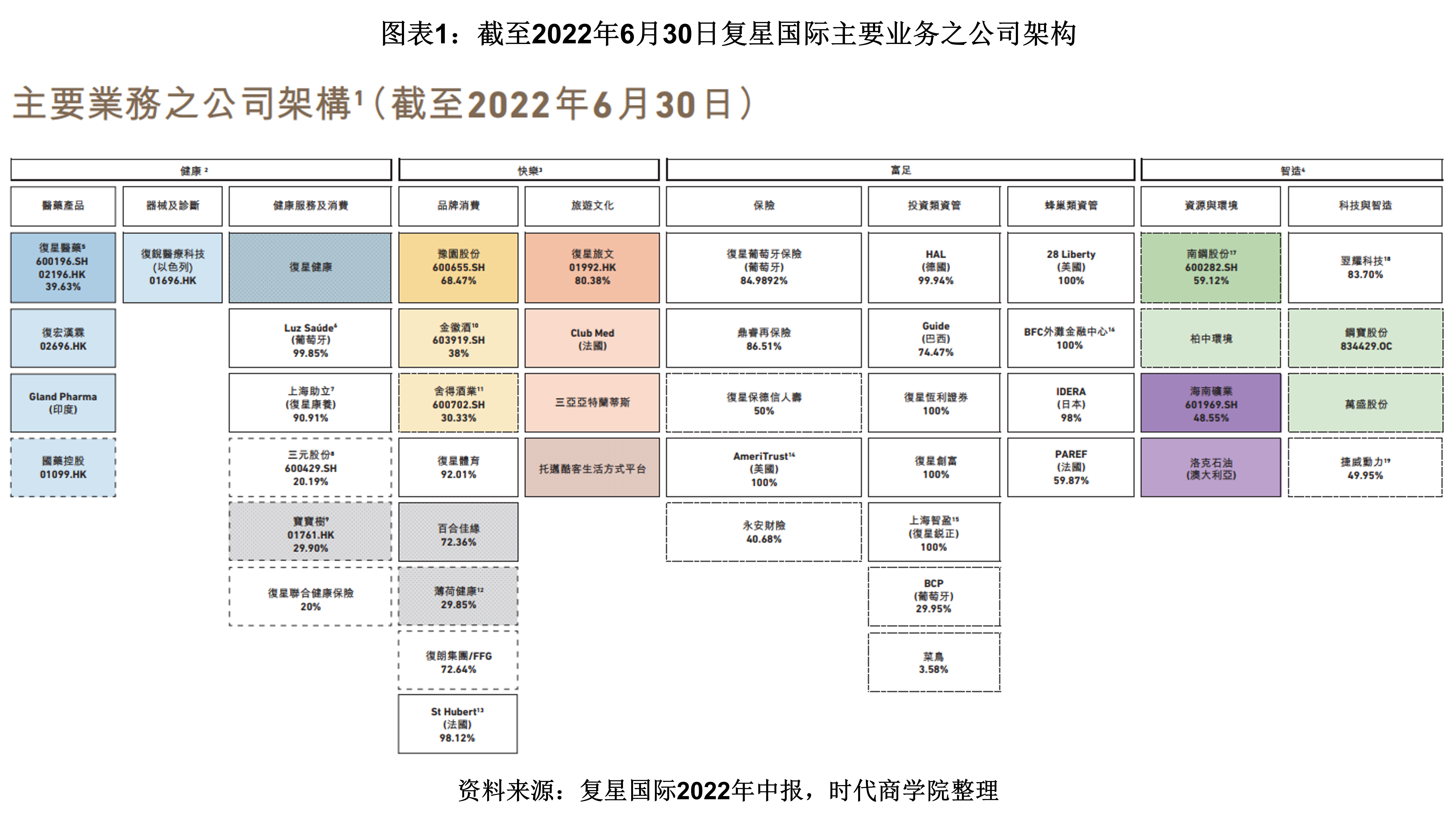 复星国际是一家全球家庭消费产业集团,深耕健康、快乐、富足、智造四大业务板块。根据复星国际2022年中报,纳入四大业务板块的参控股企业有47家。