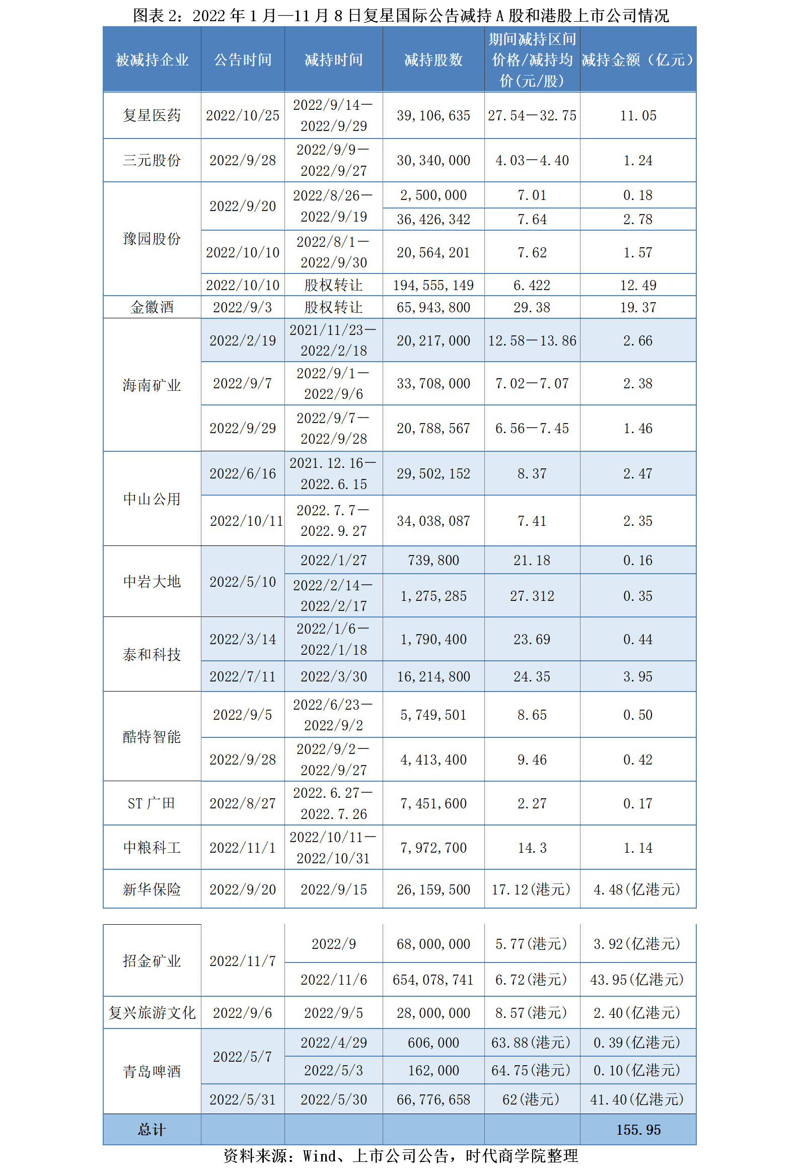 据不完全统计,2022年1月至11月8日,复星国际旗下合计18家A股和港股上市公司股份被减持或清仓出售(含披露减持或出售计划),包括复星医药(600196.SH/2196.HK)、三元股份(600429.SH)、豫园股份(600655.SH)、金徽酒(603919.SH)、南钢股份(600282.SH)、上海钢联(300226.SZ)、万盛股份(603010.SH)、海南矿业(601969.SH)、中山公用(000685.SZ)、中岩大地(003001.SZ)、泰和科技(300801.SZ)、酷特智能(300840.SZ)、ST广田(002482.SZ)、中粮科工(301058.SZ)、新华保险(601336.SH/1336.HK)、复星旅游文化(1992.HK)、青岛啤酒(600600.SH/0168.HK)、招金矿业(1818.HK)。