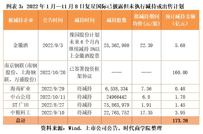 如图表2和图表3,经统计,2022年1月至11月8日,复星国际实际已减持套现金额约为155.95亿元,已披露减持或出售计划但未执行的资产金额约为173.26亿元。
