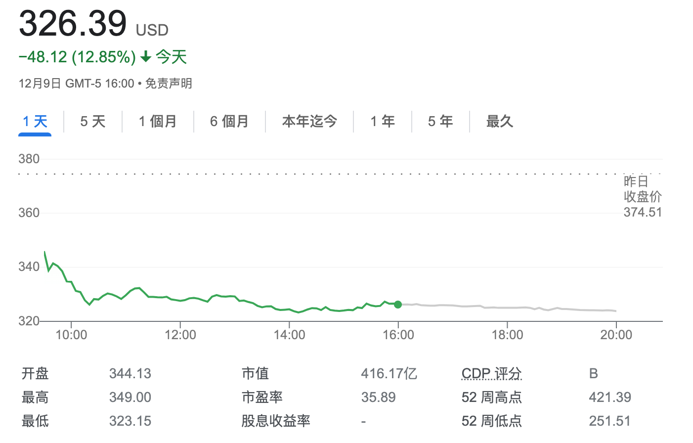 12月9日,Lululemon (LULU.NASDAQ) 公布2022财年第三财季业绩后,股价下跌12.85%,创下了自2020年3月以来疫情爆发后的最大跌幅,股价跌至326.39美元。