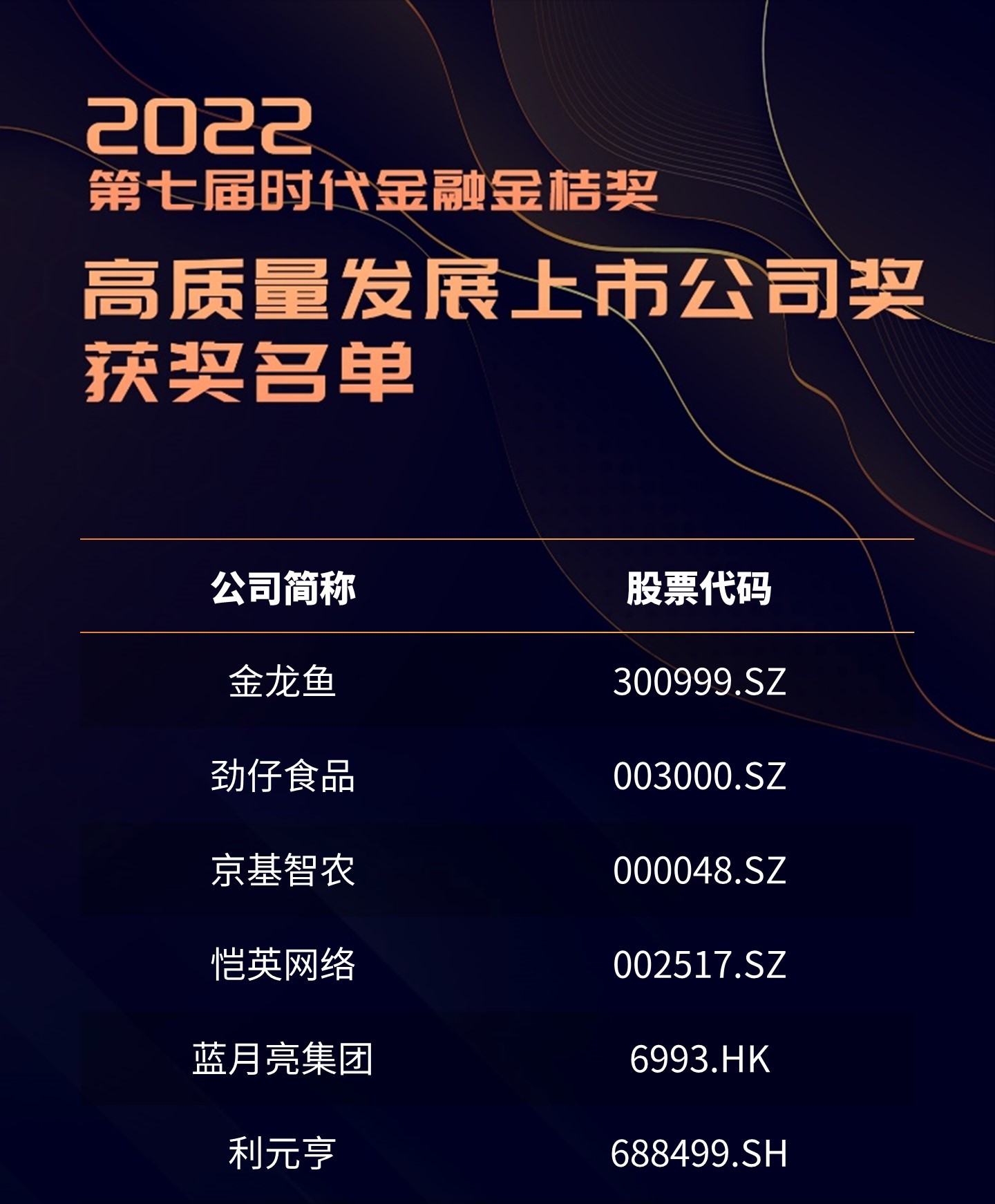 第七届时代金融金桔奖以“新格局、新发展、新机遇”为主题,其中“高质量发展上市公司奖”旨在表彰2021-2022年度为实现高质量发展而不懈努力的上市公司,以及在公司经营、技术创新、品牌塑造、融资并购等方面表现突出的上市公司。