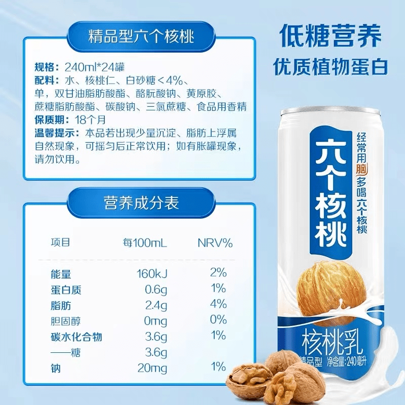 此前已有多篇报道指出,一罐六个核桃中核桃含量不足两个,单从蛋白质含量上,六个核桃并不及牛奶。国家高级营养师徐君在接受媒体采访时表示,通过“六个核桃”的成分表,就能大概算出其核桃含量。一个中等大小的核桃约重12克,根据中国食物成分表中的数据,核桃仁的重量占核桃重量的43%,核桃仁重5.16克,核桃仁中蛋白质的含量为14.9%,因此一个核桃中的蛋白质含量约为0.77克。