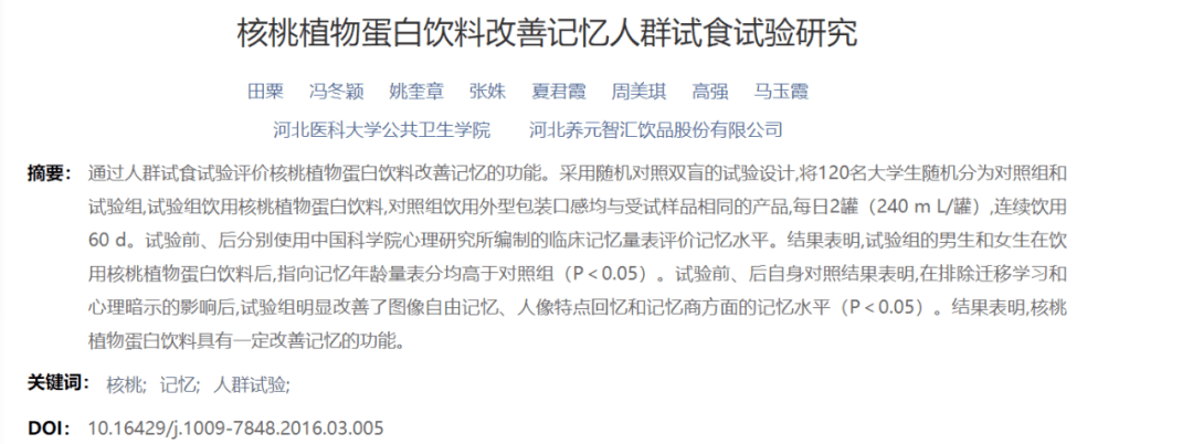 记者查询发现,《中国食品学报》2016年03期刊登了一篇由河北养元与河北医科大学公共卫生学院联合发表的文章,题为《核桃植物蛋白饮料改善记忆人群试食试验研究》的论文,该论文称“核桃植物蛋白饮料具有一定改善记忆的功能”。