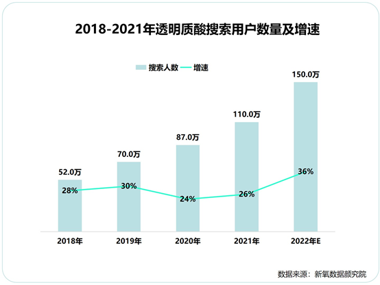 报告指出,2021年透明质酸关注用户突破110万,2022年则达到150万。5年间其增速保持在24%-36%之间。也就是说,得益于轻医美市场崛起及透明质酸市场教育成熟,透明质酸“人气指数”仍然处于爬坡期,而逐年攀升的用户体量有望带来市场新增量,将赋予透明质酸市场更广阔成长空间。