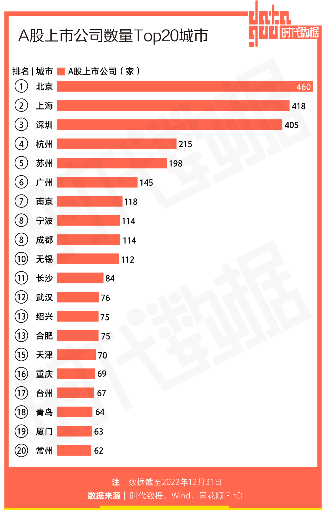 据时代数据统计,截至2022年12月31日,A股市场一共拥有上市公司5067家。其中,来自北京的上市公司最多,达到460家;其次是来自上海的上市公司,有418家;数量排在第三的是来自深圳的上市公司,有405家。此外,杭州和苏州分别以215家和198家上市公司排在四、五位。